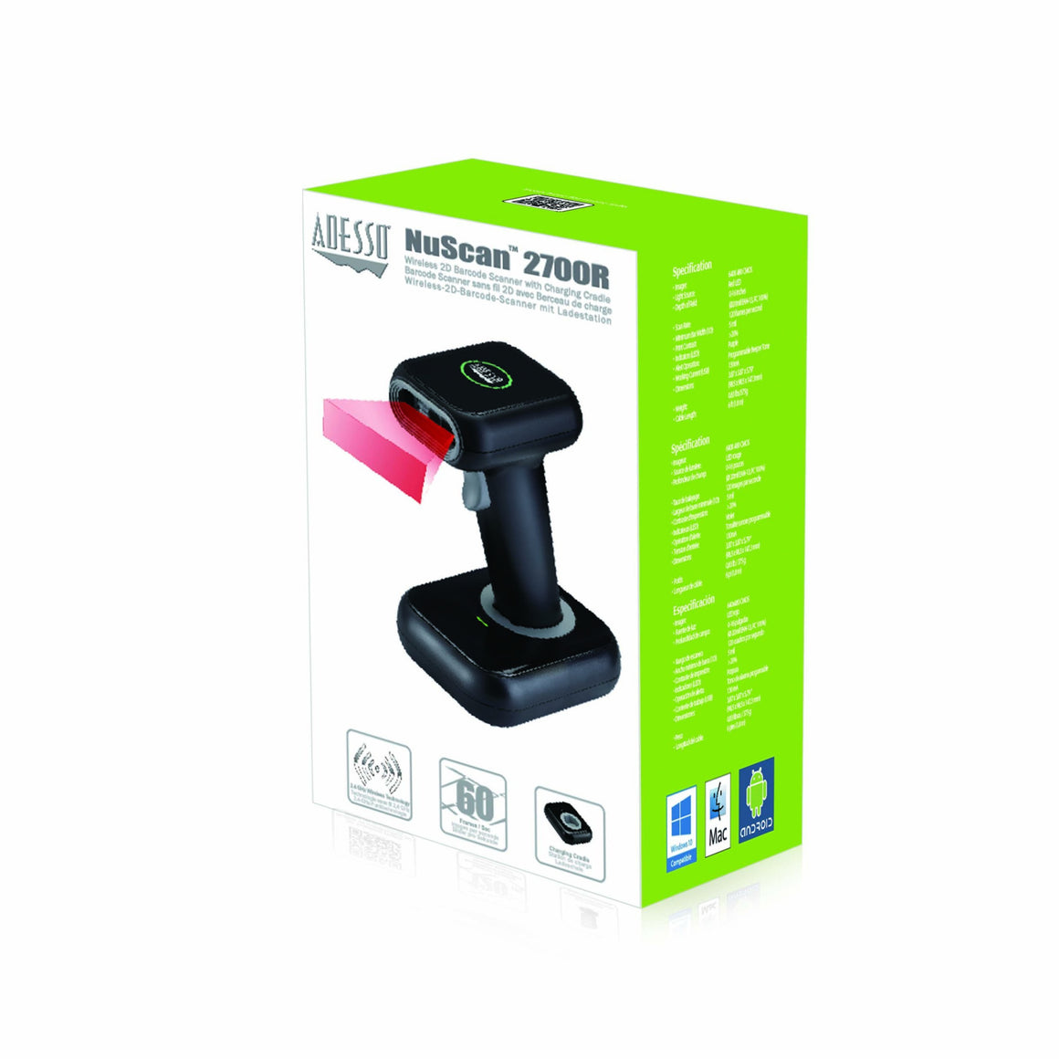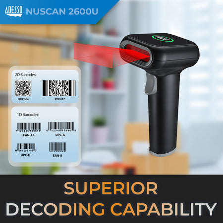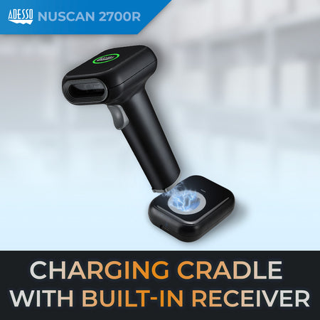 The Adesso NuScan 2700R is the ultimate wireless barcode scanning solution. Its new decoding engine allows it to decode both 2D barcodes, such as QR Code, PDF417, and Data Matrix, and 1D barcodes. The scanning rate of 120 scans per second increases accuracy, therefore increasing efficiency. The 2.4 GHz RF technology provides a wireless range of up to 150 feet. Its built-in USB receiver also makes the scanner completely Plug-n-Play!
