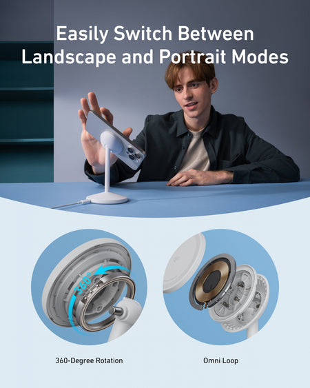 The wireless charger features a patented 360° rotating mechanism for seamless orientation changes and an adjustable tilt for the perfect viewing angle.