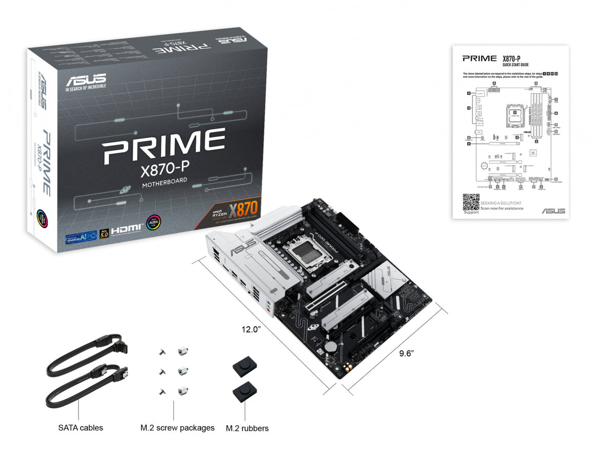 ASUS Prime series motherboards are expertly engineered to unleash the full potential of AMD Ryzen™ 9000 series processors. Boasting a robust power design, comprehensive cooling solutions and intelligent tuning options, the PRIME X870-P motherboard provides users and PC DIY builders with a range of performance optimizations via intuitive software and firmware features. It's designed to be Advanced AI PC-ready, offering the power and connectivity needed for demanding AI applications.