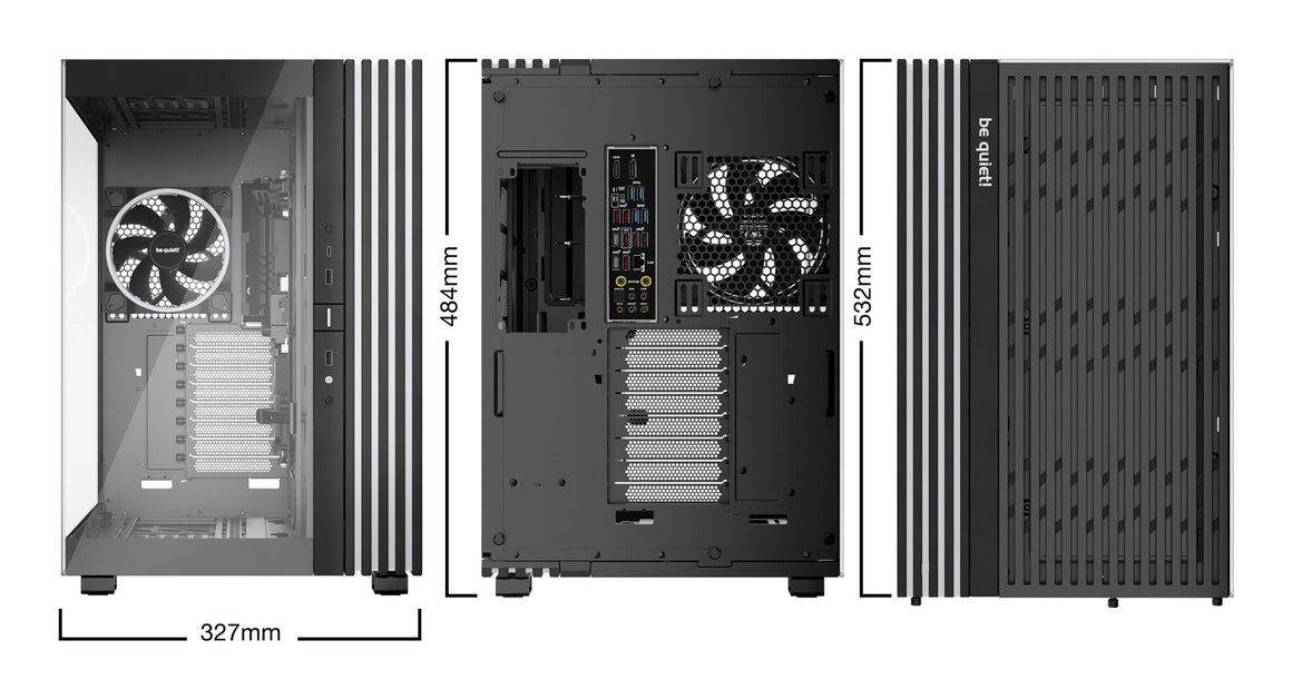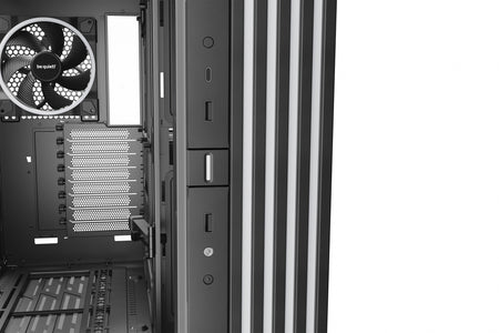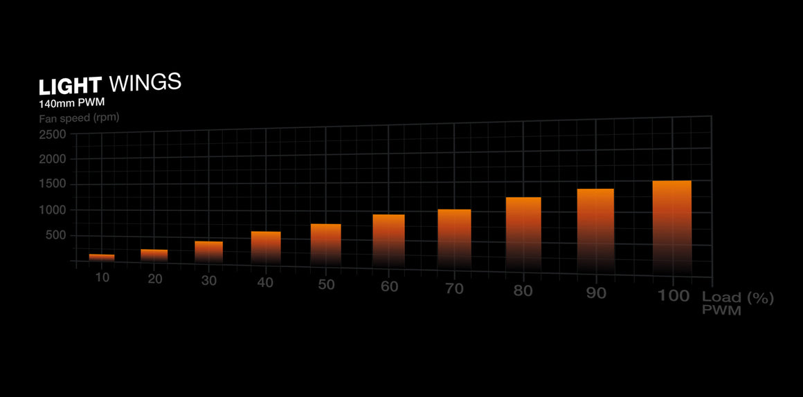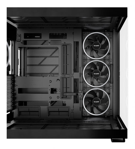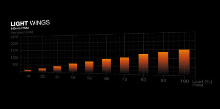Light Base 900 FX Black comes with 4 pre-installed Light Wings fans. One fan is installed as rear exhaust, 3 Light Wings 140mm PWM fans with reversed fan blades are pre-installed on the side mounting. The reverse fans make sure your system is still an eye-catcher when installed as a side intake. Their 7 airflow-optimized fan blades not only reduce noise-generating turbulences but also ensure that this fan provides the performance that is needed, even in demanding configurations.