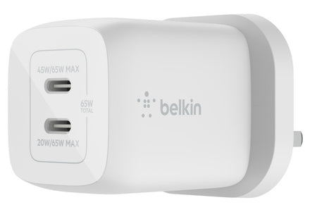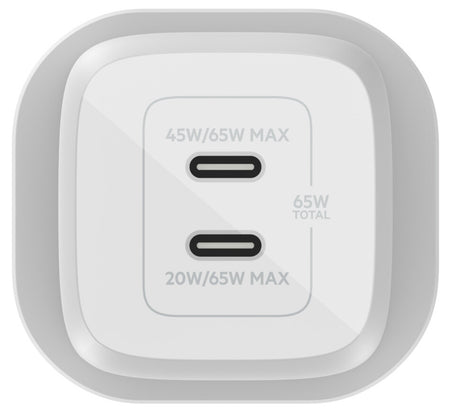 Charge your MacBook†† while fast charging an iPhone 13 at the same time with our powerful and ultra-compact 65W dual USB-C wall charger. It’s engineered with GaN, USB-C PD 3.0 and PPS charging technologies to deliver a fast and safe charge that won’t overheat or overcharge for both Apple and Samsung devices. Access up to 65W of power when using a single port or up to 45W of power from the top port and up to 20W from the bottom port when using both. It easily fits in a pocket or a bag, making it the ideal charger for traveling or when at home.