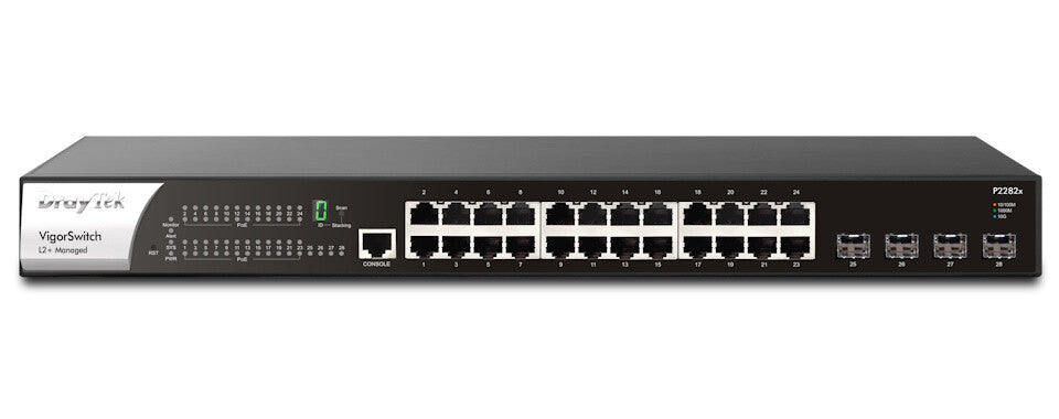 The VigorSwitch 2282x Series is a feature rich, high performance, L2+ managed Gigabit Ethernet switch with 24 1-Gigabit RJ-45 LAN ports and 4 10-Gigabit Ethernet SFP+ ports. Use the SFP+ interfaces for high-speed uplinks between switches, servers and network attached storage devices at up to 10Gbps per port.