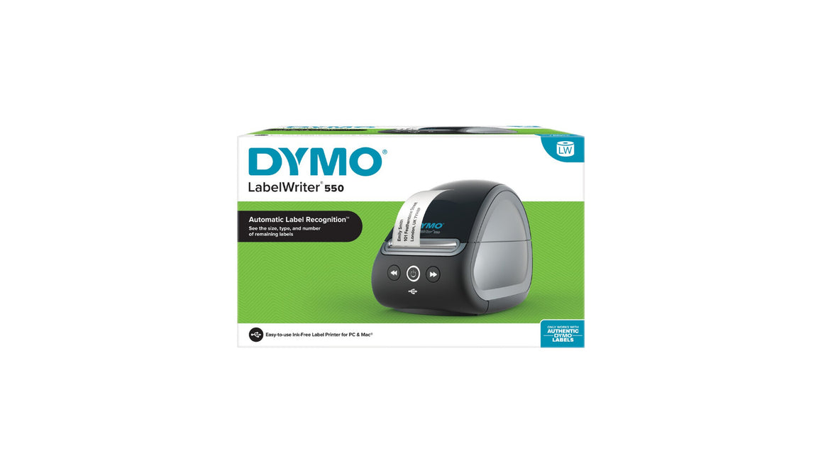 Label printing jobs come fast, accurate, and hassle-free with the DYMO LabelWriter™ 550 label printer. With its unique Automatic Label Recognition, you always know which labels (by size, type, and color) are loaded into the label maker at a glance. You’ll also know how many labels are remaining, so you'll never run out mid-job. The direct thermal printer replaces the need to buy costly ink or toner, while the portable size helps it fit into any modern workspace with ease. It's up to 20% faster than the LabelWriter™ 450. And with the ability to print precise quantities, you'll never need to wrestle with sheet labels again!