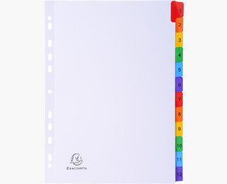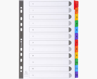 The Exacompta Indices are made from 160gsm white card with coloured reinforced plastic tabs. The indices are A4 in size and are pre-printed with 1 to 12.The indices are pre punched so they can be inserted in files and folders. The indices come with a printed index page for identifying contents.The indices come in 12 partsNumbered 1 to 12 Tabs