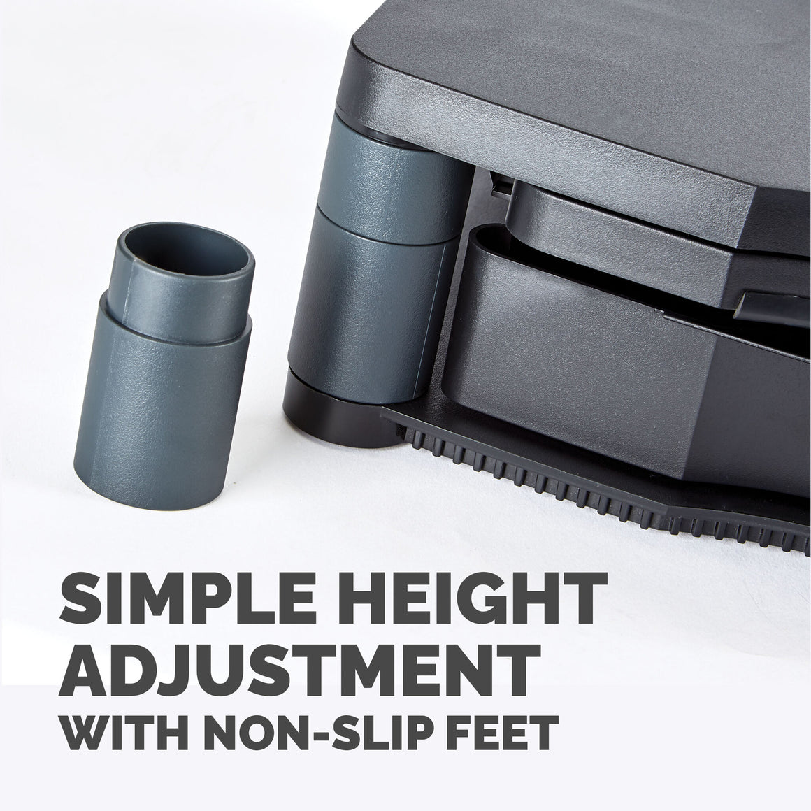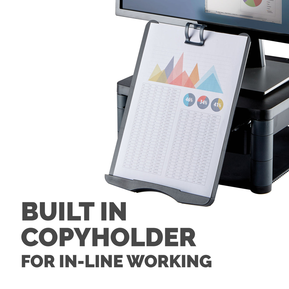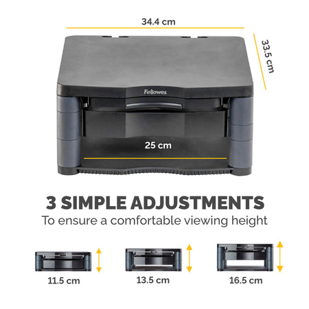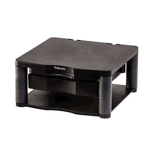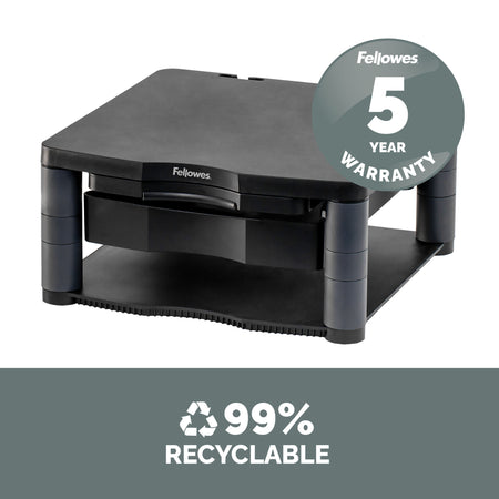 A few easy adjustments to your workstation can make a huge difference to your daily routine. Moving your head to view your screen or to read documents requires you to tilt and turn your neck and upper back. Positioning your screen incorrectly can put serious strain on your eyes, neck and shoulders which is why this Fellowes computer stand is a necessity for your workspace as it allows you to place your monitor at a more ergonomically-correct viewing position to suit you. This adjustable monitor stand can support up to a 21 Inch CRT or TFT/LCD monitor or a maximum weight of 36 kg, and features non skid foot rings, ensuring stability on any surface. Accommodate the ideal viewing angle that ideal suits your needs, the premium plus computer stand features three height adjustable settings (115-165 mm) allowing you to find a comfortable screen position accustomed to you. Organise your desk space with this monitor riser which features a 51 mm storage drawer and a built in copy holder. This monitor riser is accredited by FIRA International, an independent Ergonomic Accreditor.