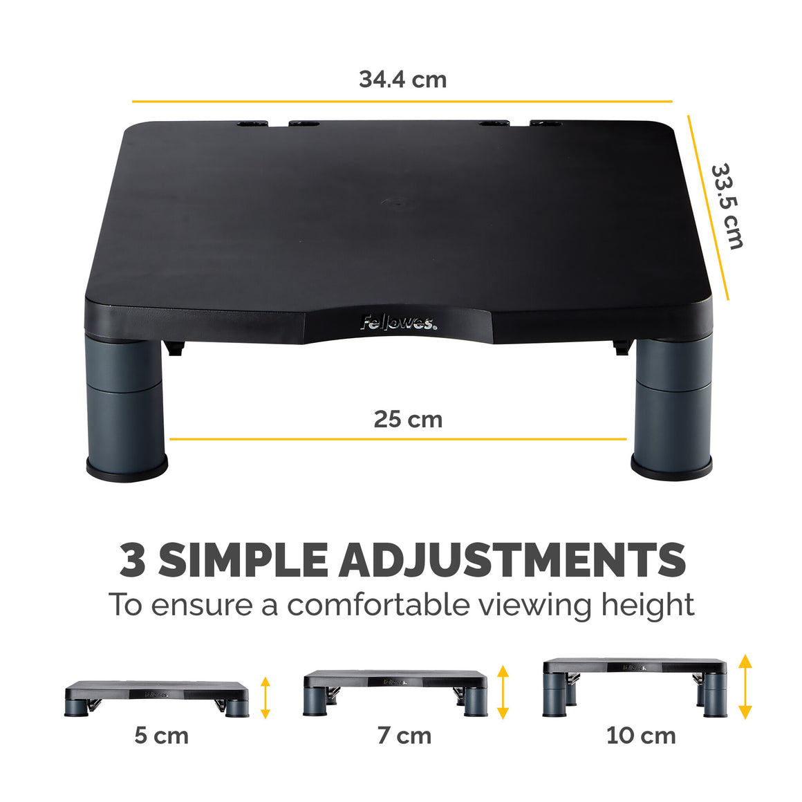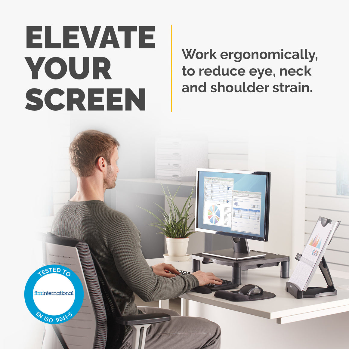 A few easy adjustments to your workstation can make a huge difference to your daily routine. Moving your head to view your screen or to read documents requires you to tilt and turn your neck and upper back. Positioning your screen incorrectly can put serious strain on your eyes, neck and shoulders which is why this Fellowes computer stand is a necessity for your workspace as it allows you to place your monitor at a more ergonomically-correct viewing position to suit you. This adjustable monitor stand can support up to a 21-Inch CRT or TFT/LCD monitor or a maximum weight of 27 kg, and features non skid foot rings, ensuring stability on any surface. accommodate the ideal viewing angle that ideal suits your needs, the Standard computer stand features three height adjustable settings (50-100 mm) allowing you to find a comfortable screen position accustomed to you. This monitor riser is accredited by FIRA International, an independent Ergonomic Accreditor, and is made from 100 percent recycled plastic so you can be sure your ergonomic solution isn't costing the earth.