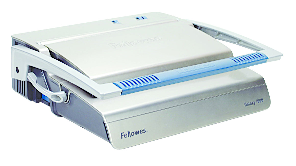 The Galaxy 500 is a high performance, manual comb binder ideal for large office, heavy duty use. Capable of binding up to 500 sheets and including many user friendly features, the Galaxy 500 is designed to make binding heavy workloads more manageable and enables you to easily produce a professional-looking bound document. This binding machine comes with the full width handle for easy punching of up to 28 sheets. Only the Galaxy range features the removable Satellite System. If you constantly find yourself fighting against a deadline, this feature allows one person to punch whilst the other binds, saving valuable time in the office. As with all Fellowes comb binders the Galaxy 500 comes with the angled comb rake to make loading punched sheets much easier and smoother. Vertical sheet loading ensures consistent punch alignment for improved punch accuracy. Includes the punch selection for A4 & A5 sized documents and back margin adjustment selector for thicker documents. Also comes with the front access, full size storage tray with patented comb and document measure for quick selection of the correct size supplies and a handy chip tray that automatically bursts open when full to eliminate jams. For the ultimate professional finish add style and colour to your documents through a wide range of Fellowes covers and combs. Includes a starter kit for 20 documents.