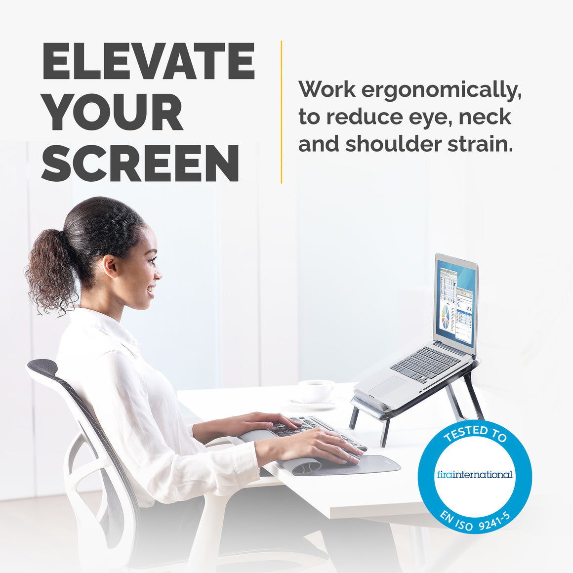 Fellowes I-Spire is designed to provide a range of solutions that transform your home office into an inspiring work environment. Work in both style and comfort with the I-Spire Series laptop riser from Fellowes which features a contemporary and stylish design. Whilst offering 7 simple height adjustments, the I spire laptop lift folds flat providing an excellent portable yet ergonomic solution which is perfect for in the office or on the go. Position your screen at a more comfortable viewing height with this I-spire portable laptop stand which features fold out legs to optimise screen positioning on any laptop up to 17". The I-spire laptop holder raises your laptop screen to eye level and positions the screen at a more comfortable viewing height with simple adjustments, relieving the stress placed on your shoulders neck and eyes. The contemporary and clean design of the I-spire laptop holder prevents your laptop from overheating as well as complementing the modern workspace perfectly. I-Spire offers a complete range of home-office comfort solutions. With cushioned supports for your wrist, lumbar supports, foot lifts and monitor stands and laptop stands, you'll be able to work much more comfortably away from your regular office.
