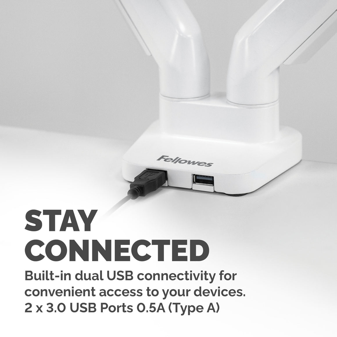 Sitting or standing with bad posture all day using a computer is bad for your health. Leaning forwards or tilting your head up or down not only causes back and neck strain but is also bad for your eyes. Fellowes Platinum Series monitor stands will improve your ergonomic posture and reduce back neck and eye strain. With ever shrinking office spaces, using monitors stands means you can free up valuable work space to become more organised and productive. With effortless adjustment you can collaborate and share information with colleagues easily, making them perfect for hot desks or shared desks. This fully independent adjustable monitor stand by Fellowes can pan 180°, tilt +/-45° (90°) and can rotate 360° via innovative gas spring technology allowing for effortless movement. Built in dual USB connectivity and intuitive cable management allows you to stay connected and minimise clutter at the same time with the Fellowes Platinum Series monitor mount. Easily mounted via clamp or grommet, each arm holds a monitor up to 8kg (up to 40" monitors) and meets VESA monitor bracket standards.