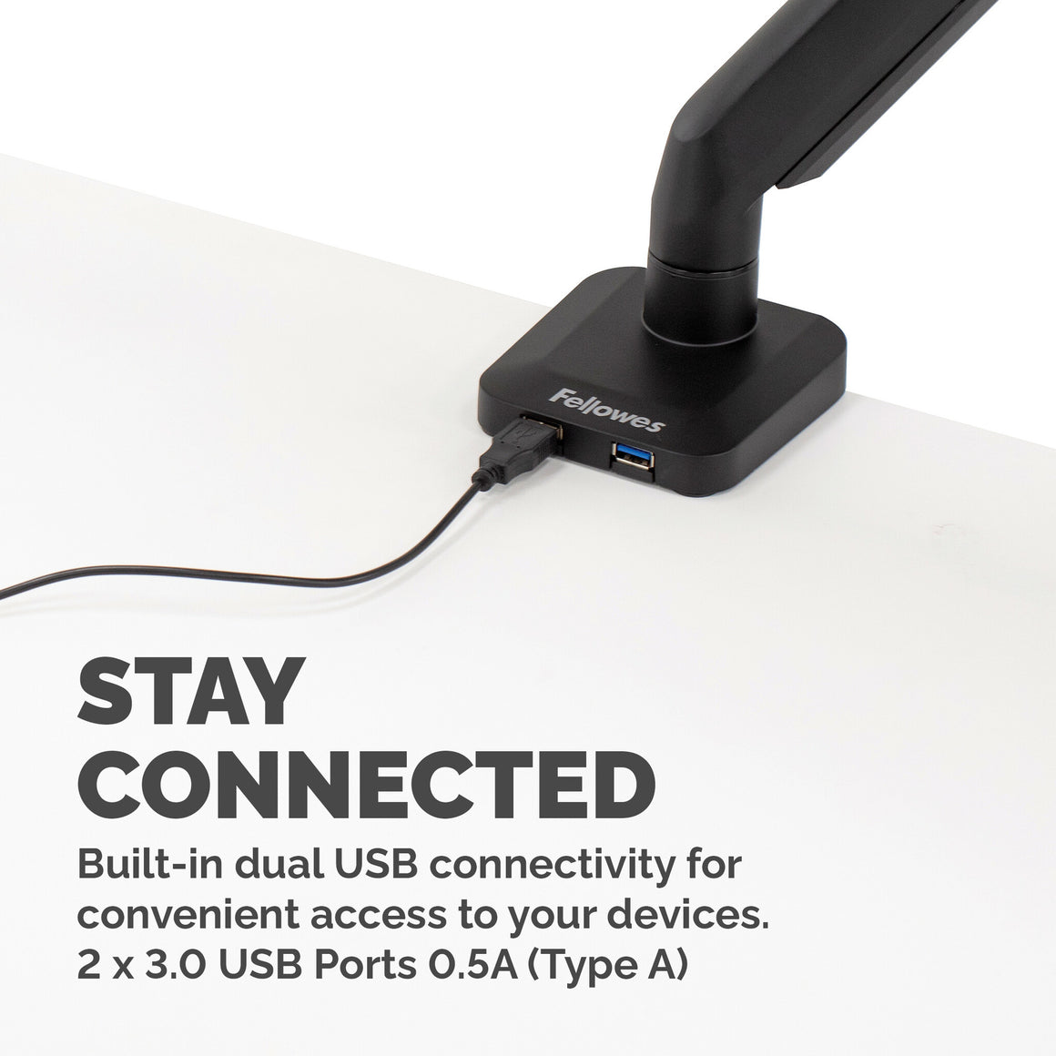 Sitting or standing with bad posture all day using a computer is bad for your health. Leaning forwards or tilting your head up or down not only causes back and neck strain but is also bad for your eyes. Fellowes Platinum Series monitor stands will improve your ergonomic posture and reduce back neck and eye strain. With ever shrinking office spaces, using monitors stands means you can free up valuable work space to become more organised and productive. With effortless adjustment you can collaborate and share information with colleagues easily, making them perfect for hot desks or shared desks. This fully independent adjustable monitor stand by Fellowes can pan 180°, tilt +/-45° (90°) and can rotate 360° via innovative gas spring technology allowing for effortless movement. Built in dual USB connectivity and intuitive cable management allows you to stay connected and minimise clutter at the same time with the Fellowes Platinum Series monitor mount. Easily mounted via clamp or grommet, each arm holds a monitor up to 8kg (up to 40" monitors) and meets VESA monitor bracket standards.