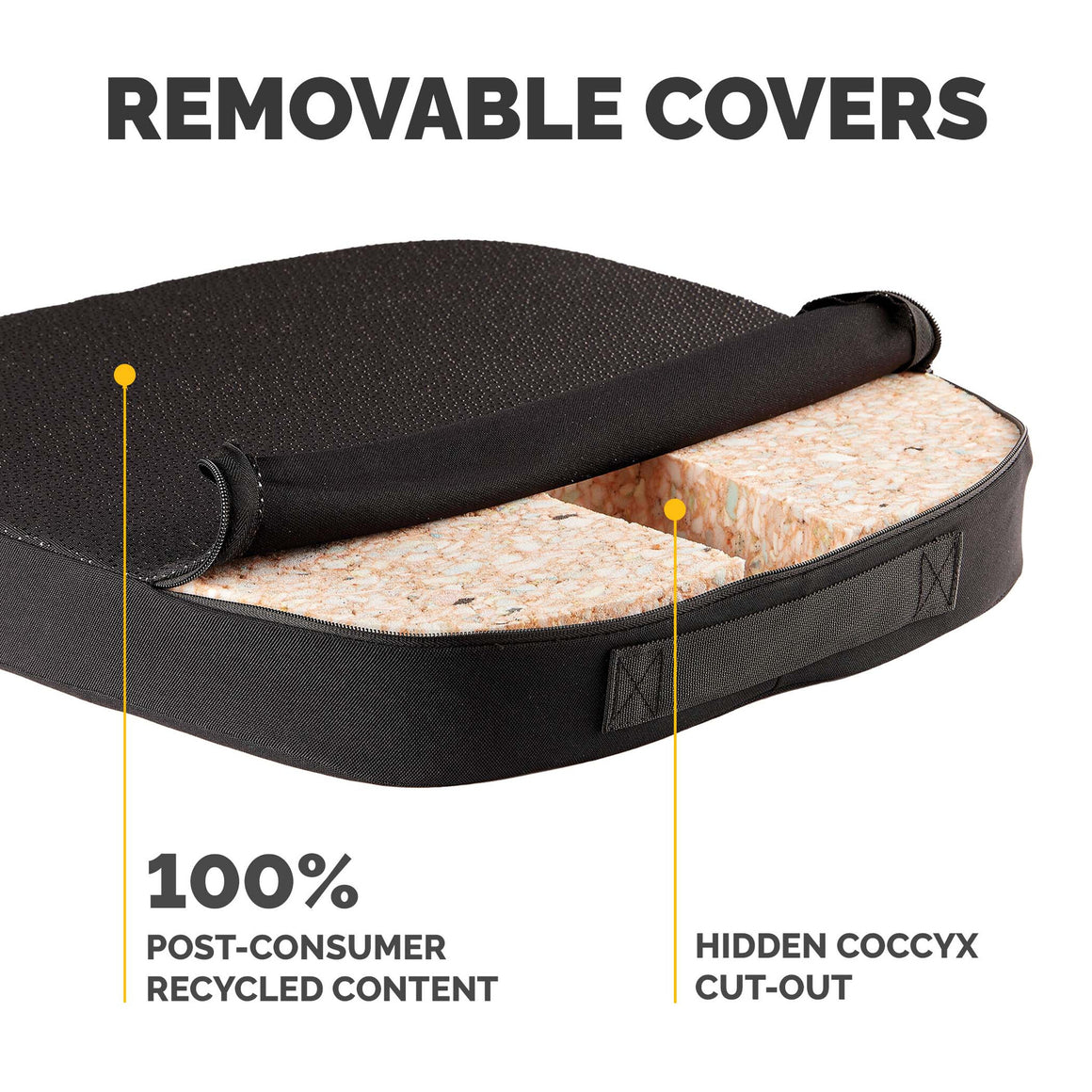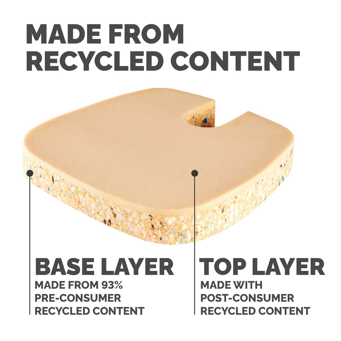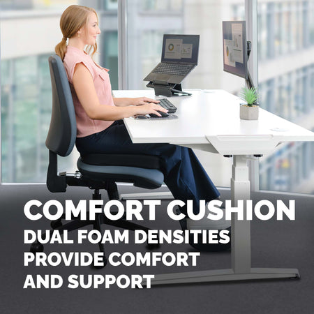 The Breyta comfort seat cushion is designed to reduce fatigue and discomfort caused by extended sitting with its dual foam densities that provide both comfort and support. It helps promote ergonomic posture by increasing sitting height, making it ideal for use at your workstation, home, or office. A discreet hidden coccyx cutout at the back of the cushion relieves pressure at the base of the spine. For added convenience, the seat cushion includes a built-in carry handle for easy transport. Sustainability is also a key feature, with the base layer foam made from 93% pre-consumer recycled content, the top layer foam containing post-consumer recycled content from mattresses, and the fabric cover crafted from 100% post-consumer recycled polyester.
