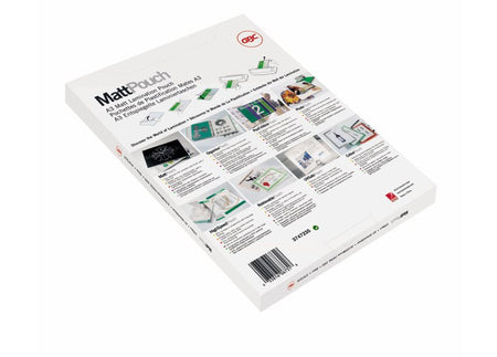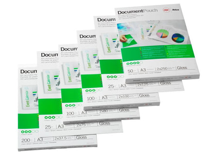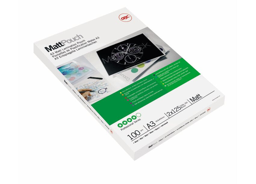 Protects frequently handled documents with a tough matt laminate that adheres to both sides of pages, minimises glare and enables ‘writeability’. 75 micron, matt. A3 format. Pack size: 100.