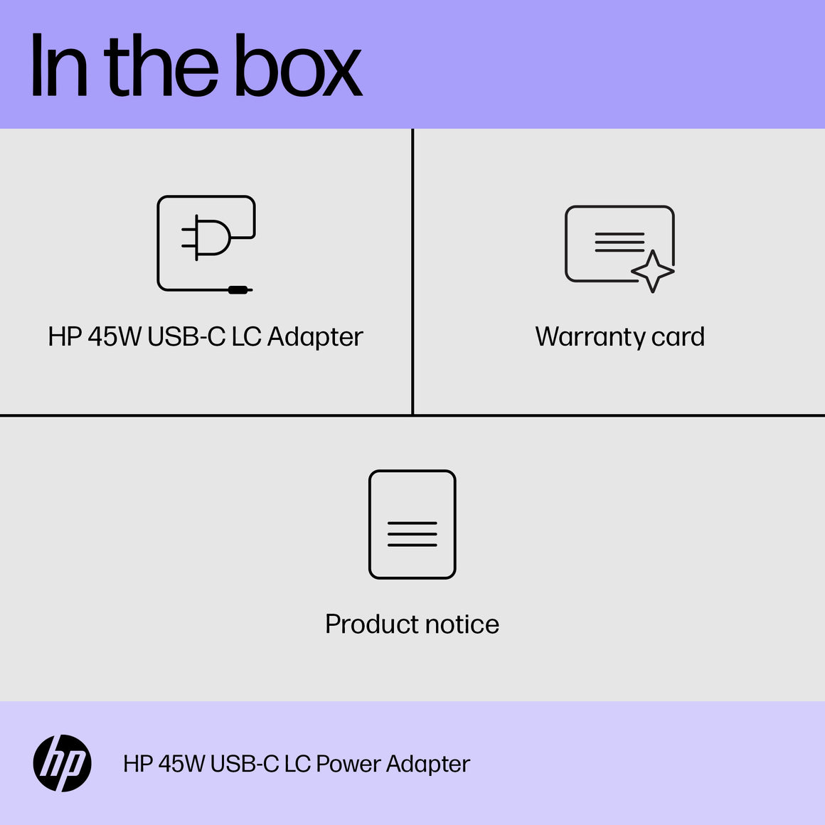 Power and charge your HP Chromebook[1] from its USB-C port with the HP 45W USB-C LC Power Adapter.