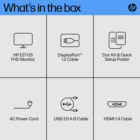 Monitor; DisplayPort™ cable; HDMI cable; Warranty card; USB Type-B to A cable; Quick Setup Poster; AC power cord |