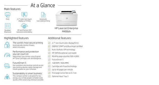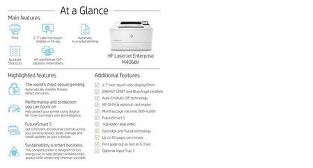 HP LaserJet Enterprise M406dn printer; HP Black Original LaserJet Toner Cartridge (~3,000 pages); Getting started Guide; 1 Power cord |