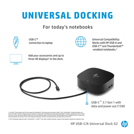 Get to work fast with one cable from your USB-A- and USB-C™-enabled notebooks[1] to your displays, devices, and wired network with the flexible, compact HP USB-C/A Universal Dock G2. The dock is driven by DisplayLink and compatible with notebooks from HP, Apple, Dell, Lenovo, and more.[2]