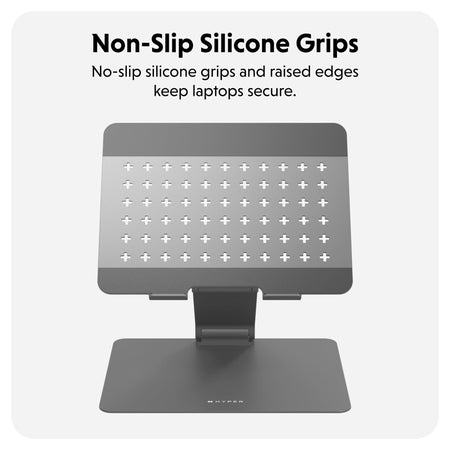 The HyperSpace Ergonomic Adjustable Laptop Stand has been designed to hold laptop and tablets up to 16” in size, and allows users to flexibly elevate their laptop up to a custom angle. This adjustable stand features a sturdy aluminium design with non-slip silicone grips as well as raised edges to stop the device moving and coming off the stand. The stand can also be folded down for easy storage and/or travel.