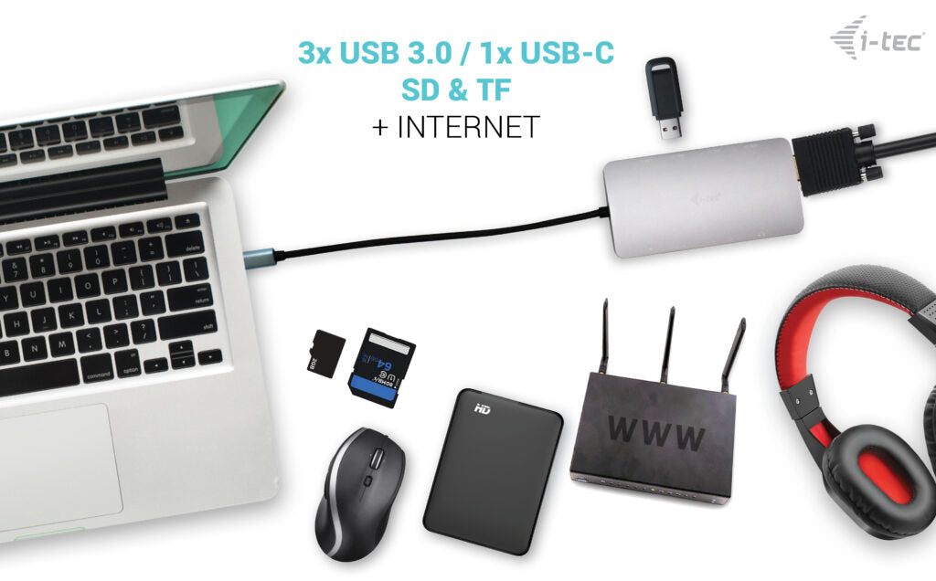 Small metal USB-C docking station capable of easily connecting an external monitor or projector via an HDMI or VGA port. Simply connect your laptop or tablet (no need to install drivers) and reap the benefits of quick USB data transfer, connection to the internet via a LAN port, and the ability to connect your headset. And of course, the docking station can also power your laptop with up to 100 W, meaning you will be able to charge all laptops and tablets that support charging via USB-C (USB-C Power Delivery).