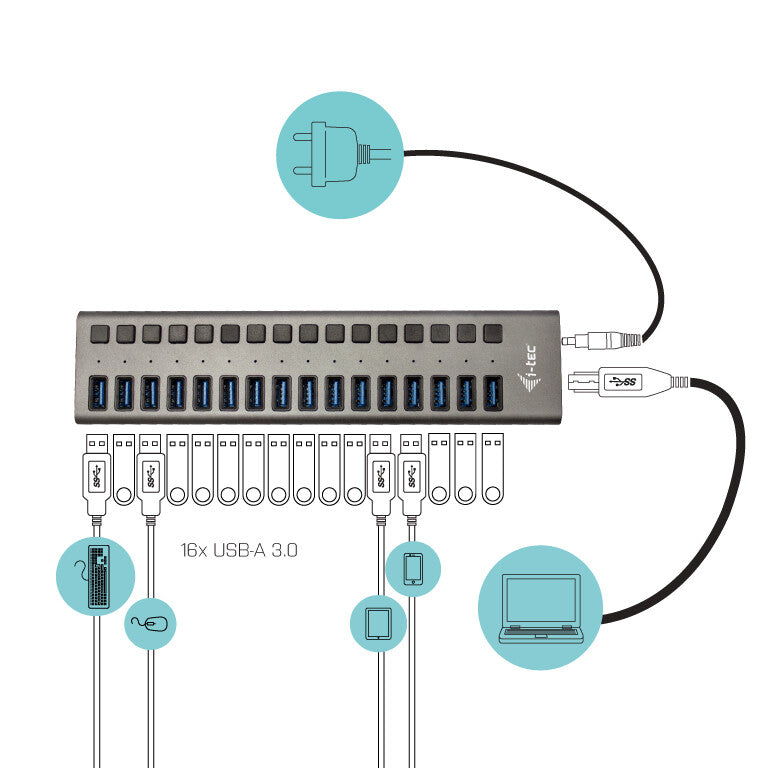 Long product description: i-tec USB 3.0 Charging HUB 16port with power adapter 90 W, 16x USB 3.0 charging port, ideal for laptop ultrabook tablet PC, Windows Mac Linux
