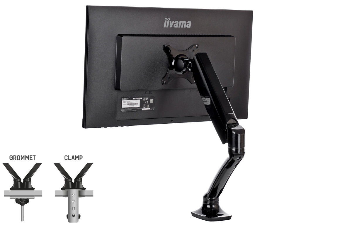 The iiyama DS3001C-B1 is a desk mount (grommet or clamp) for flat screens up to 27”. Using the arm guarantees you gain additional space on your desk and the cable management system helps to keep the workplace tidy. But more importantly, offering broad adjustment capabilities including tilt, swivel, height and rotation, the arm makes sure you can easily adjust the screen position to your preferences assuring ergonomic body posture.