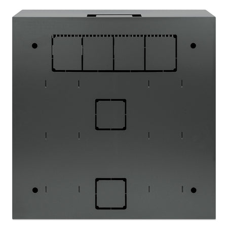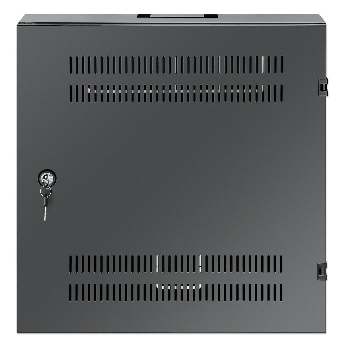 Thanks to its compact depth, it only extends 170 mm (6.7 in.) from the wall, but its vertical mounting option means you can install even bulky equipment like network switches with a depth up to 280 mm (11 in.). The sturdy IP20-rated steel housing with antistatic powder coating can be locked with a secure three-point door lock to prevent damage, tampering or theft. It carries a load capacity up to 60 kg (132 lbs.), and ventilation slots ensure maximum airflow to keep your equipment cool. Your structured cabling can enter through pre-punched holes on the top, rear or bottom. Its fully assembled shipping condition saves you the trouble of putting it together.