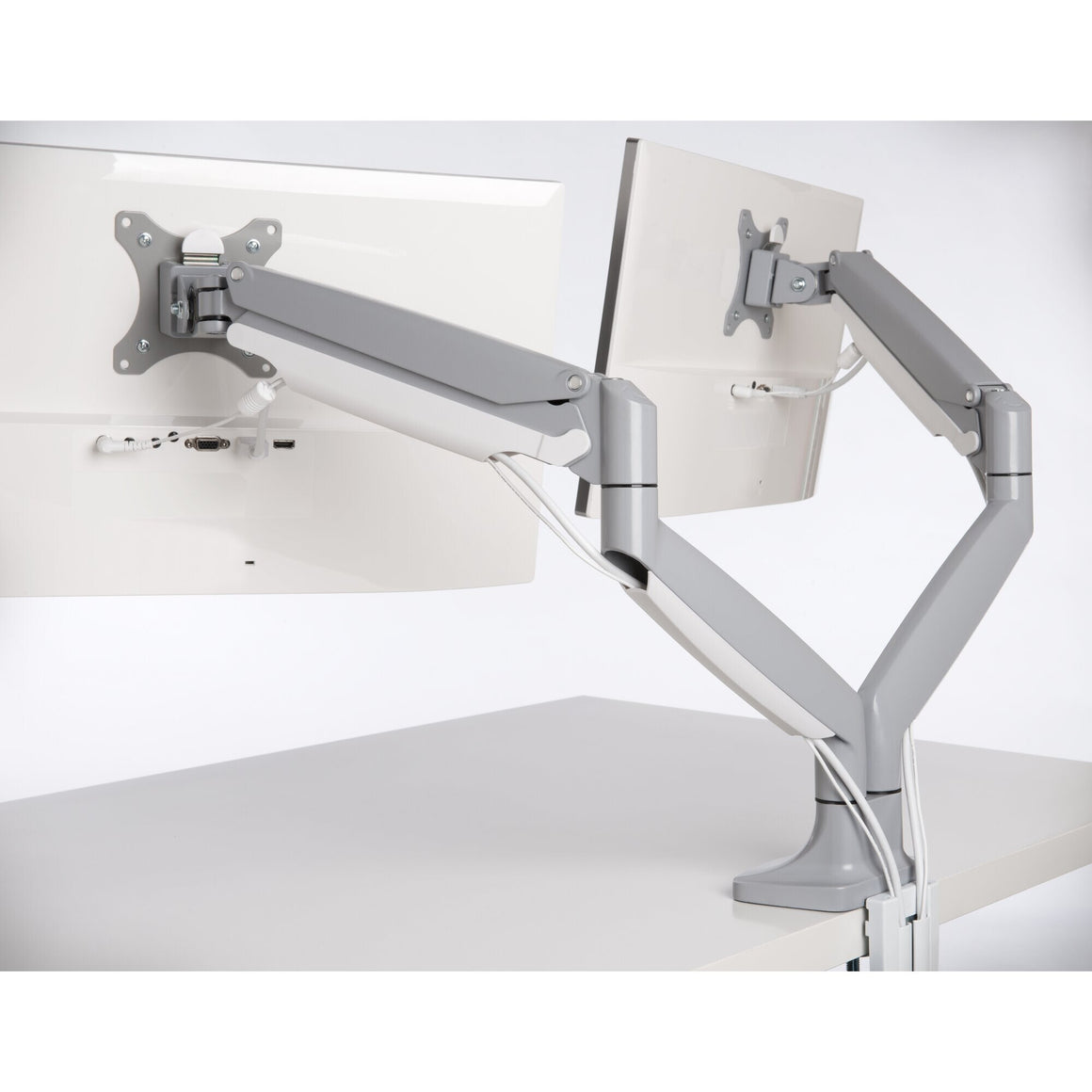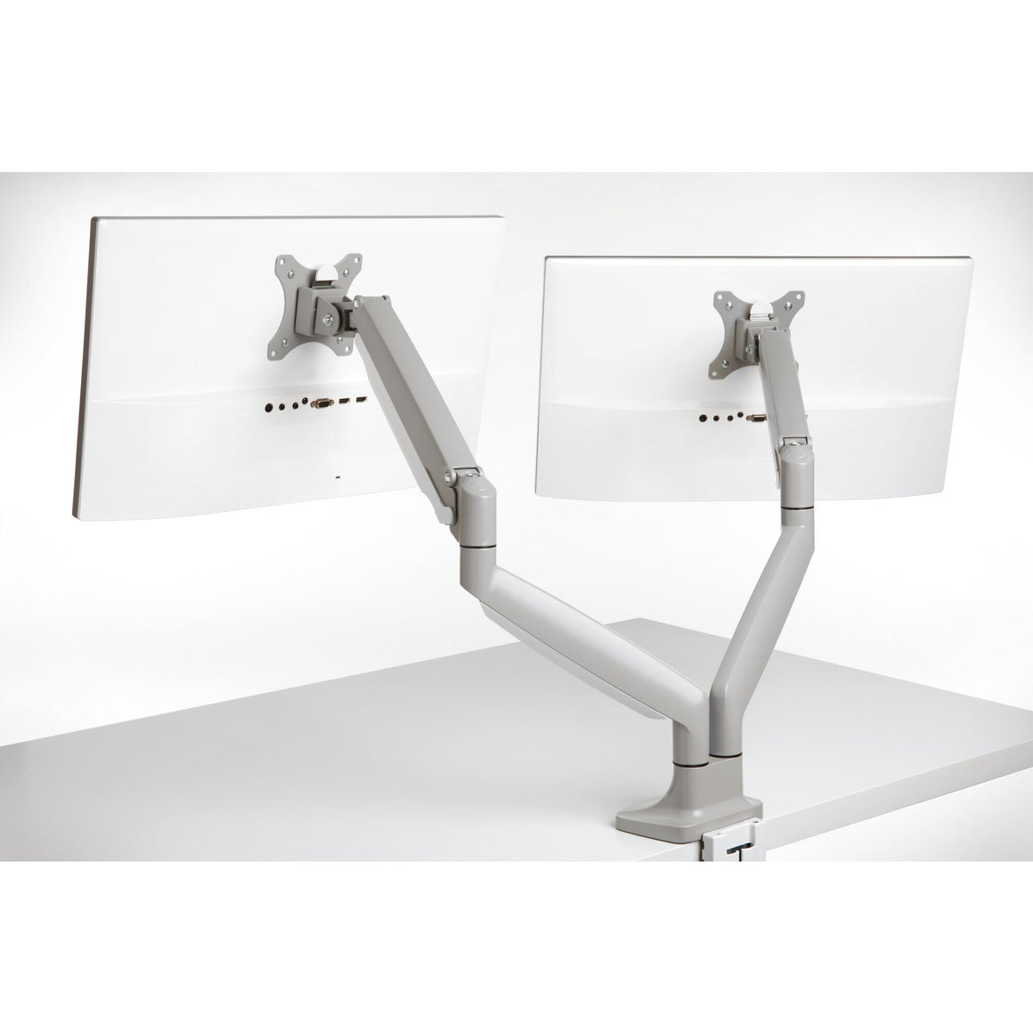 Adjustable monitor arms enable professionals to easily raise, lower, tilt and swivel their screens, facilitating more comfortable viewing angles. The SmartFit™ One-Touch Height Adjustable Dual Monitor Arm supports improved posture, proper eye alignment and neck and shoulder comfort. Ergonomically designed to promote wellness and increase productivity, it simplifies proper ergonomic fit and allows users to adjust the height, depth and angle of their monitors for individualised comfort. Stable at any position, it allows you to easily switch your monitors from landscape to portrait mode.