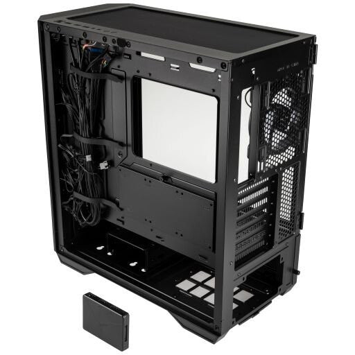 Below the main chamber is a dedicated PSU shroud, which has a removable panel to grant easier access to this narrower section. In the shroud is space for an ATX power supply, up to 190mm long, and a drive cage that holds two 3.5” HDDs. What’s more, there are mounts for three 2.5” SSDs upon the rear side of the motherboard backplate – truly offering extensive and flexible support for your storage solution.
