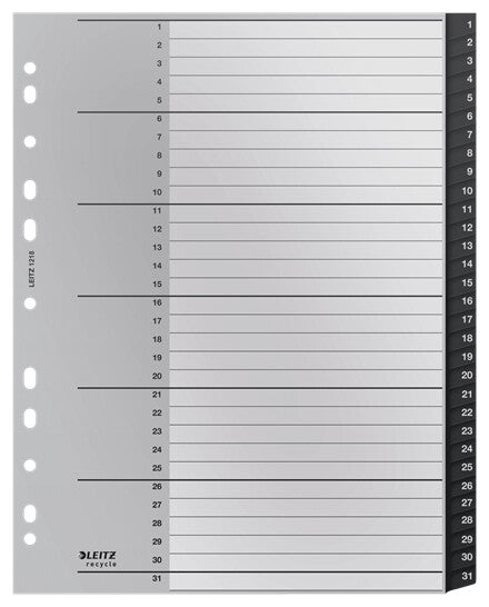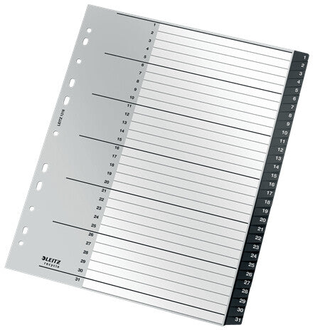 Premium quality extra wide A4 Folder Divider, 1-31 numerical tabs tabs. 90% (pre-consumer) recycled plastic and 100% recyclable. For clear organisation of A4 documents, helps in keeping track of important notes or school paperwork, for home, school or office use. This robust index perfectly complements other products from the Leitz Recycle range and is made to last. Modern and contemporary green stationery that will look great at home and in the office. With the eco friendly Recycle range from Leitz you can both improve your office environment – and the environment of our planet.