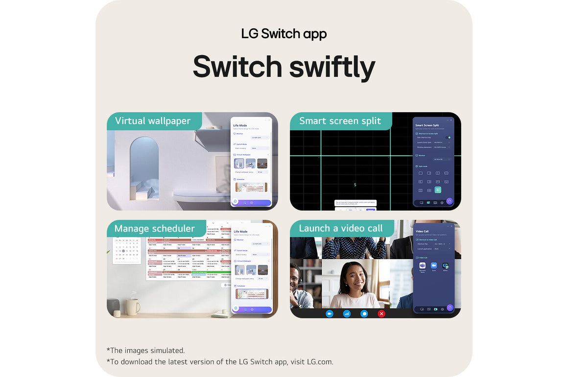 LG Switch app helps to optimize the monitor to your work and life. You can readily divide the whole display up to 6, change the theme design, or even launch a video call platform with a mapped hotkey.