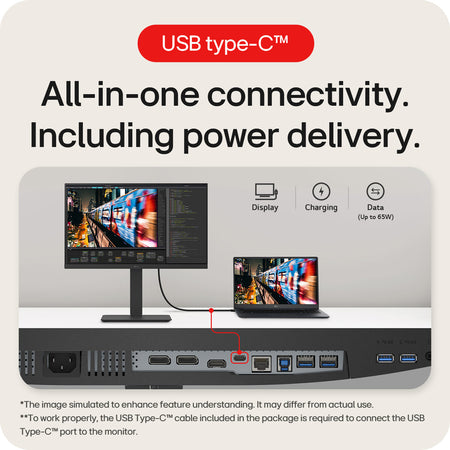 USB Type-C™ port allows from display and data transferring to connected device charging (up to 65W), enabling support for your laptop all at the same time over a single cable.