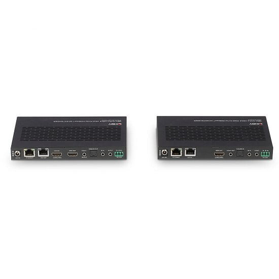 ARC support over HDMI allows for audio content to be returned from the display to a connected amplifier or soundbar, while local audio extraction allows for the connection of audio outputs for immersive multi-channel audio. Audio embedding or de-embedding at the transmitter side can easily be switched via the push button on the main unit while it supports audio de-embedding at the receiver side to connect an audio source.
