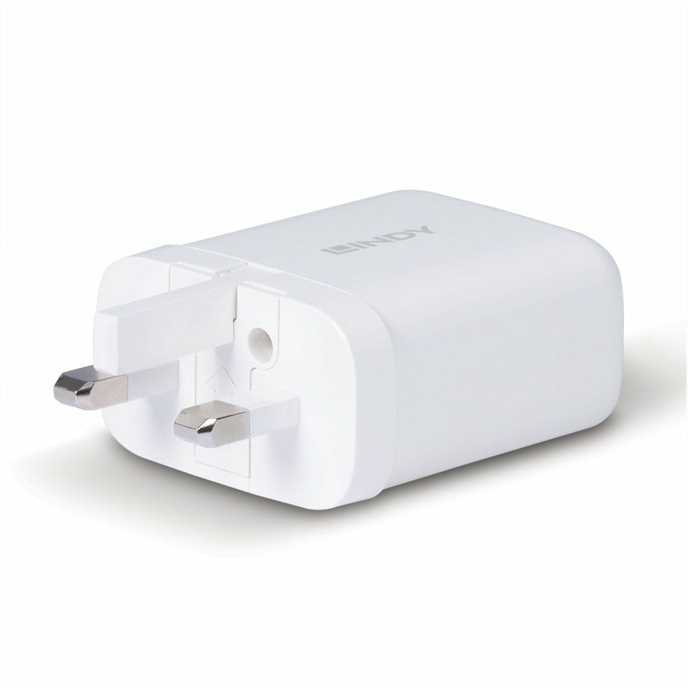 The Lindy 65W USB Type A & C GaN Charger can charge two devices simultaneously. 65W Power Delivery and PPS are supported by the USB Type C port while the USB Type A port provides fast charging with up to 45W. When both ports are used in parallel a maximum power of 20W will be provided.