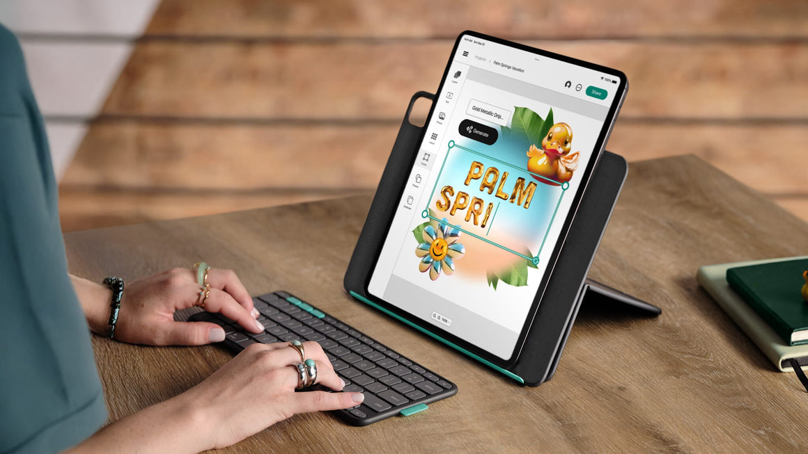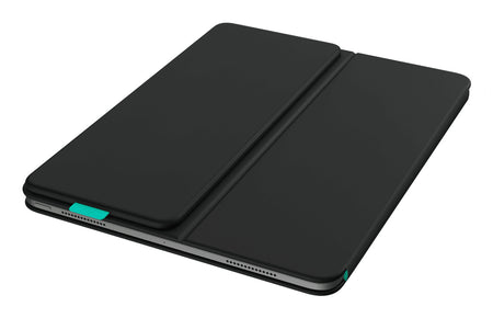 Flip into fun. Or focus. Detach the Bluetooth keyboard and place it anywhere. Then snap it back onto the case magnetically to stow it away. Adjust the kickstand to find the right angle, and position iPad in landscape or portrait modes.
