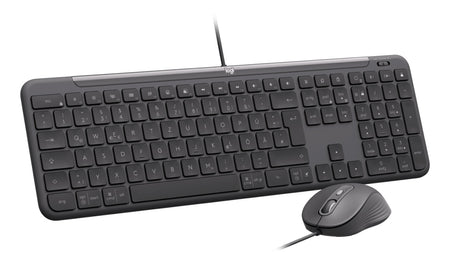 Multi-OS USB-C keyboard and mouse combo with laptop-style typing and ambidextrous mouse for workplaces that require wired connectivity.