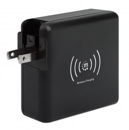 The Manhattan 4-in-1 Travel Wall Charger and Powerbank 8,000 mAh provides you with incredibly useful functions on one device. Use it as a USB wall charger to charge smartphones, tablets, eReaders, headphones and more from two USB-A and one USB-C port with per-port power up to 5 V / 2.4 A. You can also skip the wires altogether and charge compatible mobile devices on the 5 W wireless charging pad. For even more convenience, this all-rounder lets you charge on the go without plugging into a socket since it's also an 8,000 mAh powerbank. Its convenient digital number display lets you check the remaining battery at any time. Recharge the powerbank directly via AC on a power outlet or through its USB-C port. Finally, if you're an international traveler, you'll love its foldable US and swappable UK and EU plugs that let you charge devices in the many regions that offer these outlet types.