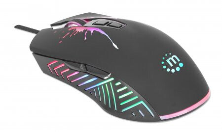 The Manhattan RGB LED Wired Optical USB Gaming Mouse combines modern design with advanced precision and high-stabilization performance. Its top-mount push-button instantly shift resolution from 1200, 2400, 4800 and 7200 dpi to suit a wide range of applications, including gaming or daily computing tasks. Its full-sized shape and seven-button configuration provide direct access to essential commands with minimal wrist movement. A non-slip texture applied to critical surfaces provides a secure, comfortable grip. Plug-and-play capability and Windows® compatibility offer quick and easy installation.