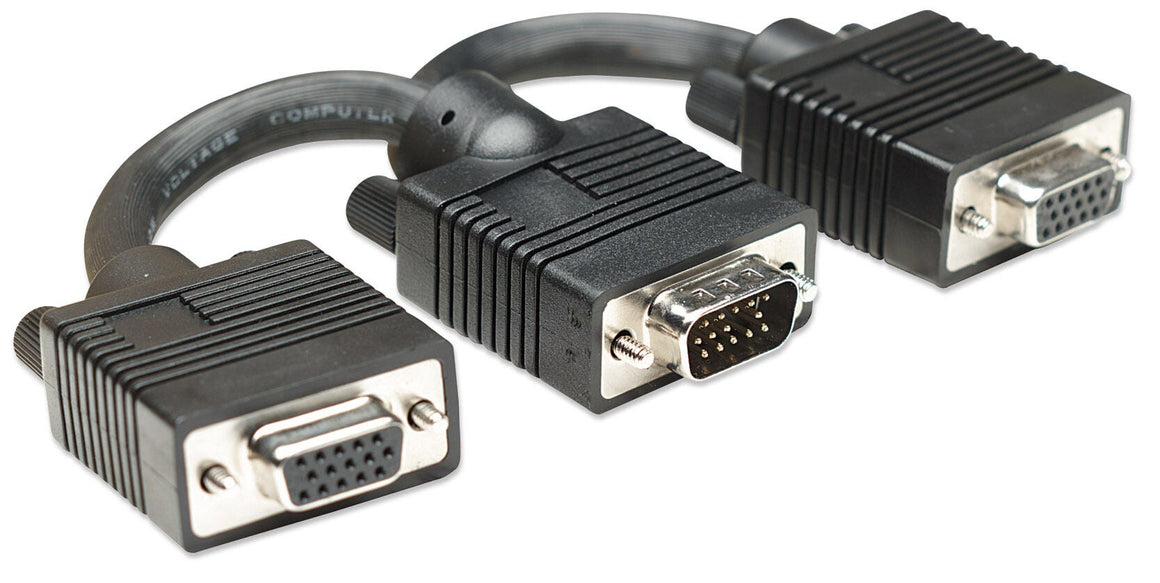 Manhattan SVGA Y Cables easily split a single signal to connect a desktop or notebook computer with two monitors. Ideal for use with any HD15-equipped display, computer or device, Manhattan SVGA Cables are engineered and constructed of quality materials to deliver dependable transmissions in video applications. Full foil and braided shielding, moulded boots with strain relief and mini-coax (RGB) and paired video wire construction help provide maximum conductivity and clear, crisp images with reduced EMI interference and distortion over extended distances.