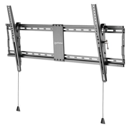 This tilting TV Wall Mount from Manhattan safely holds your TV and offers a toolless +3 to -12° tilt adjustment with the turn of a knob for optimized views. Constructed of 2 mm thick reinforced powder-coated steel, it fits flat and curved LCD, OLED or plasma TVs up to 100" and weighing up to 70 kg (154 lbs.) with VESA compliance up to 800x400. You're all set for a confident above-the-floor installation with an included bubble level that helps get the mount perfectly horizontal on the wall, and intuitive snap-in spring locks with release cords let you easily and securely put the TV in place. It's ideal for residential, office, hospitality, classroom, conference room, digital signage and other commercial applications. An anti-theft opening allows you to attach a padlock to prevent your valuable display from being removed and stolen.
