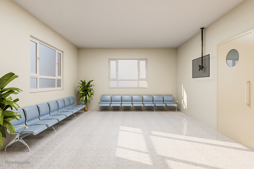 The Neomounts CL35-340BL12 is a full motion ceiling mount for flat screens up to 42". The unique tilt (25°) and swivel (360°) technology allows the mount to change to the optimal viewing angle. Level adjustment is available for the perfect installation.