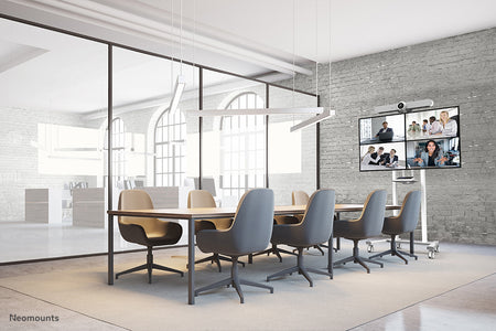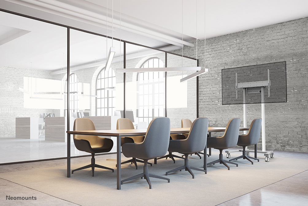 The Neomounts FL55-875WH1 MOVE Lift is a mobile floor stand for displays up to 100" with a maximum weight capacity of 110 kg. The trolley has 65 cm motorized height adjustment (35 mm/second), is operated with a wired remote control and features an anti-collision system for extra safety. A lockable, ventilated hardware compartment with cable opening is included and optional for installation.