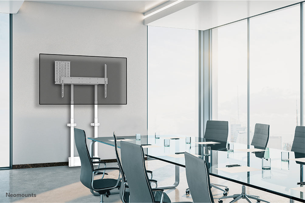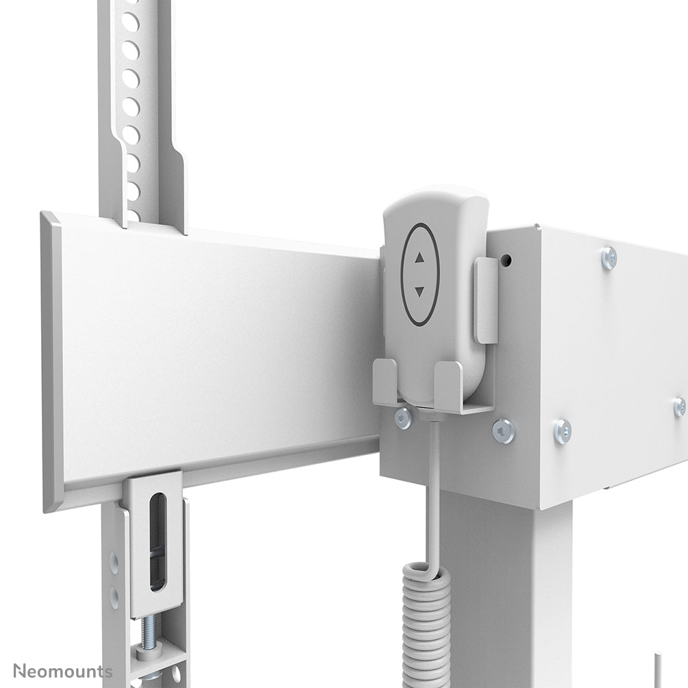 The Neomounts WL55-875WH1 MOVE Lift is a wall mount for displays up to 100" with a maximum weight capacity of 110 kg. The mount has 65 cm motorized height adjustment (35 mm/second), is operated with a wired remote control and features an anti-collision system for extra safety. A lockable, ventilated hardware compartment with cable opening is included and optional for installation.
