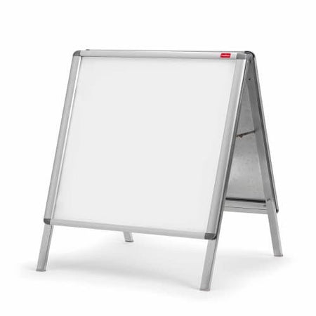 This basic 700 x 1000mm A-frame pavement sign is ideal for securely displaying notices, posters, advertisements and important information in storefronts, on pavements, or in high-traffic areas. Bordered by an aluminium 30mm trim, the a-board sign features a snap-open and snap-close design allowing for quick and easy hassle-free document changes - ideal for both temporary or permanent displays. The poster stand features a double sided display that maximises visibility, allowing your message to be seen from both directions and a support bar for additional stability. Lightweight and portable, the 700 x 1000mm pavement sign is collapsible ensuring quick and convenient storage, while the anti-glare cover protects your documents from dirt and moisture while keeping it clearly visible. The non-reflective surface is also easy to wipe clean, ensuring your message always looks its best. 700 x 1000mm poster frame size. Be clear with Nobo.