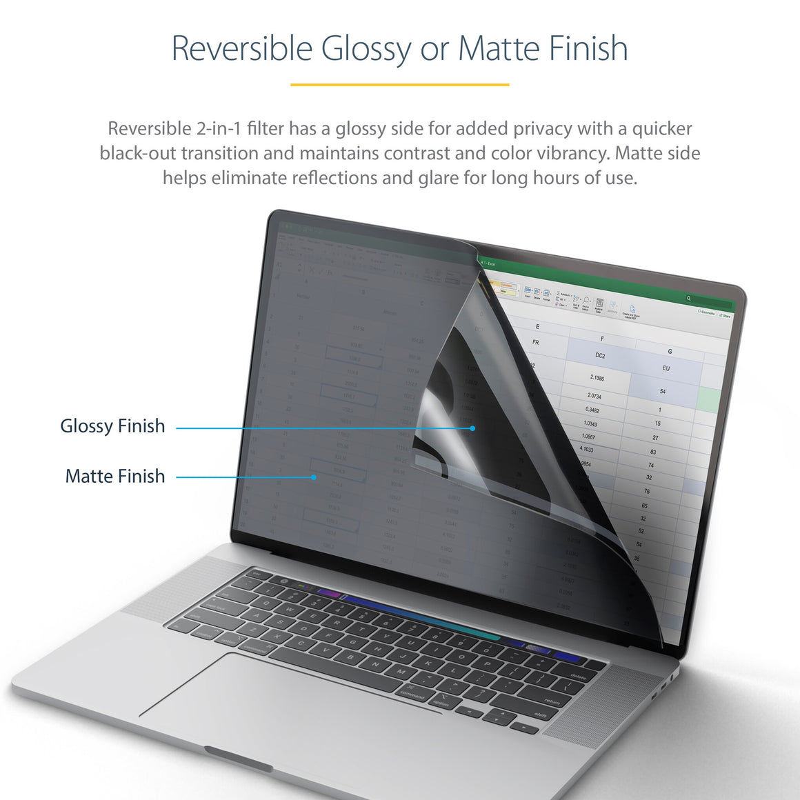The privacy screen protector is reversible, with a matte anti-glare side for environments prone to glare and a high-gloss side that helps retain color vibrancy. The matte side provides additional screen protection with a fingerprint and scratch resistant coating. The privacy shield has a light transmittance of 57.5% providing optimal screen brightness and enhanced levels of privacy.