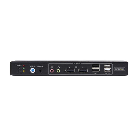 Share a mouse, keyboard, USB hub, and dual 4K 60Hz DisplayPort monitors, between two DisplayPort-enabled computers, featuring dual-view video matrix capabilities