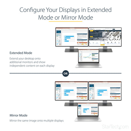 Using the MST hub, you can extend your desktop onto additional monitors and stream independent content to each display, giving you the freedom to multitask and increase your productivity. You can also mirror the same image onto multiple displays for remote viewing applications such as digital signage.