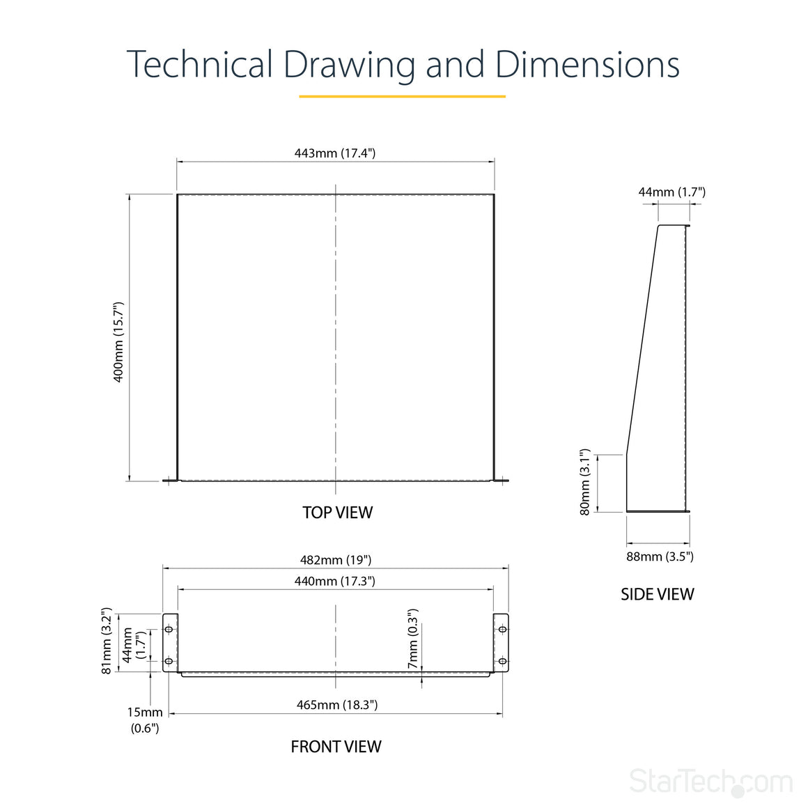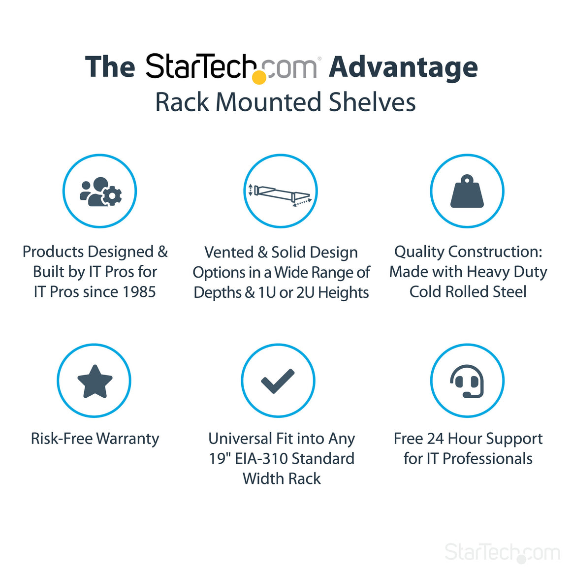 Universally mountable in any standard front mount 19” server rack or cabinet, the rack shelf is constructed of sturdy, cold-rolled steel for long-term durability.