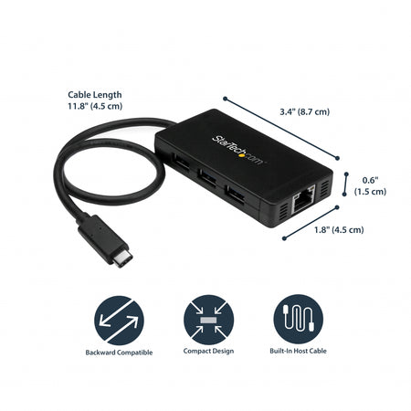 StarTech.com 3-Port USB 3.0 Hub plus Gigabit Ethernet - USB-C - Includes Power Adapter~3-Port USB-C Hub with Gigabit Ethernet - USB-C to 3x USB-A - USB 3.0 (5Gbps) - Includes Power Adapter