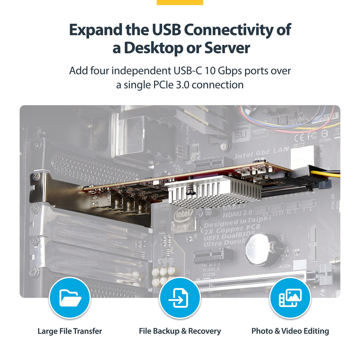 Expand the USB connectivity of a desktop computer or server by adding four external USB Type-C 10Gbps ports with this internal PCI Express 3.0 expansion card.