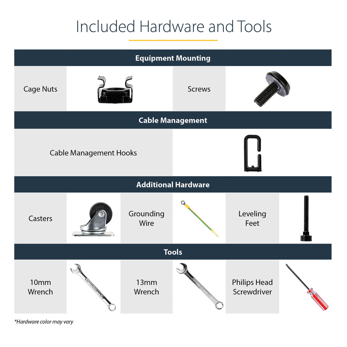 For a complete rack solution that saves you time and hassle, the rack includes optional accessories such as casters, leveling feet and cable management hooks. The base is also pre-drilled for securing the rack to the floor if needed, providing you with many options to customize the rack to fit your environment.