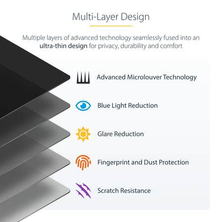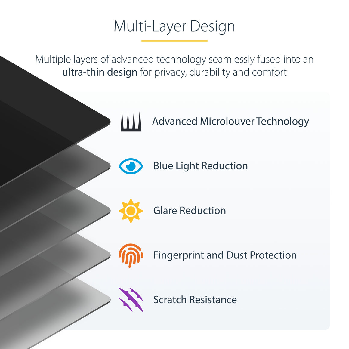 This Blue Light Reduction Privacy Shield reduces eye strain and improves visual comfort by blocking 40% - 51% of the blue light emitted from the display (in the 380nm - 480nm wavelength range). Symptoms of digital eye strain, such as headaches, dry eyes, and blurred vision, can be alleviated by using blue-light filtering privacy screens.
